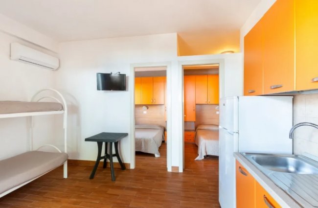 Un appartamento in palazzina composto da unico ambiente con angolo cottura più letto matrimoniale e letto a castello, bagno privato con doccia, veranda coperta ed attrezzata;